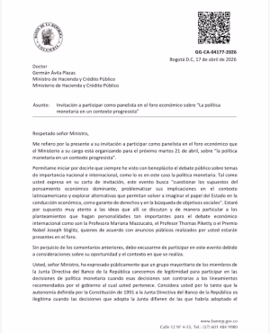 El documento, fechado el 17 de abril de 2026 en Bogotá, marca un punto de inflexión en la relación entre el Ejecutivo y la autoridad monetaria. Villar declinó asistir al evento titulado “La política monetaria en un contexto progresista”, argumentando que el contexto actual no es adecuado para su participación.
